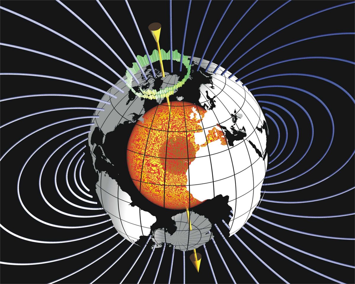 Schematische Darstellung des Erdmagnetfeldes, sowie den Ort seiner Entstehung — den Erdkern (Abbildung: Martin Rother, GFZ)